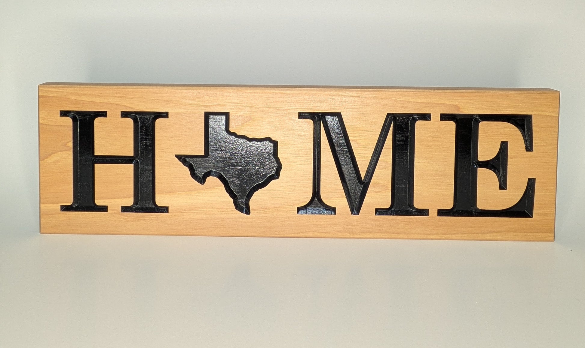 This handmade pecan wood sign spells out "home," featuring the state of Texas as the letter "o." Expert CNC routing ensures precise craftsmanship, while the hand-painted black acrylic lettering creates a striking contrast against the warm pecan wood. Chamfered edges add subtle depth and character, and keyhole slots on the back allow for secure, easy hanging. Perfect for adding a refined, Texas-inspired accent to any interior space. The sign is finished with a spray spar urethane finish making it durable for hanging outdoors as well.